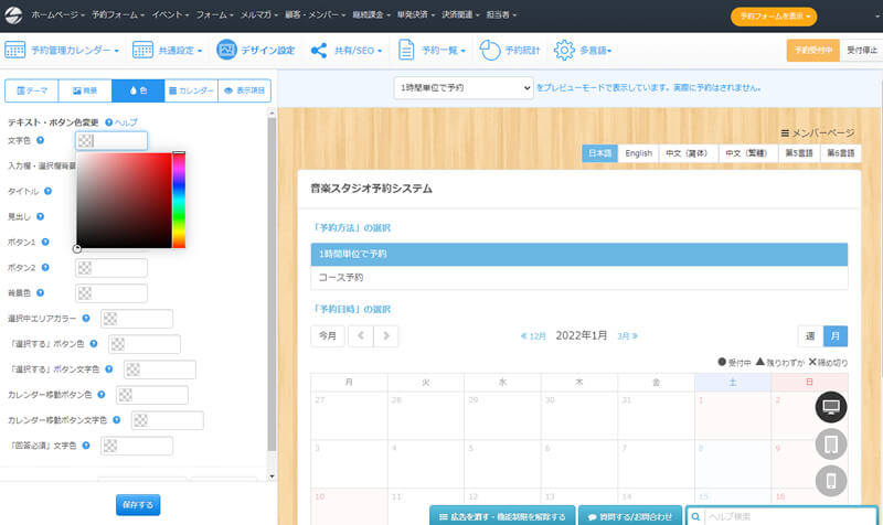 SelectTypeは高度なデザイン設定機能をご用意しておりますので、音楽スタジオ・レンタルスタジオのコンセプトに沿ったオリジナルデザインでの予約カレンダー・予約フォームを作成することが出来ます。