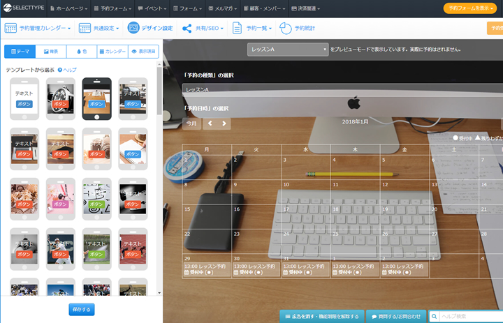 SelectTypeの予約システムでは豊富なデザインテンプレート/画像素材をご用意しておりますので、簡単操作で予約フォームのデザインテイストを一新することが出来ます。