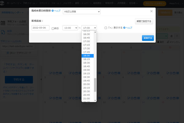 SelectTypeの予約システムは柔軟なスケジュール調整・設定が可能です。基本的な受付時間の設定のみならず、突発的な休館・受付時間の短縮・受付時間の延長など柔軟に設定調整いただけます。イレギュラーなお休みや受付枠の調整も広範囲にカバーします。