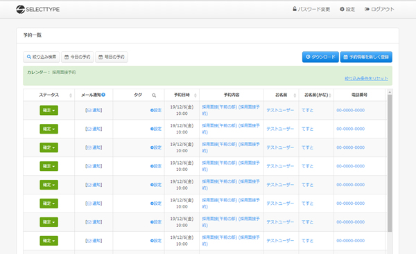 お電話などWEB以外で受付けた面接応募情報も、スタッフが代行登録していけば「予約台帳」としてご活用いただくことが出来ます。