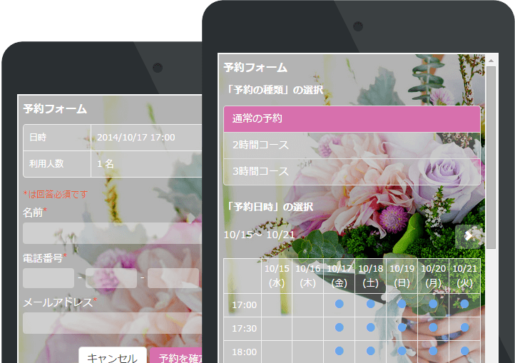 生徒様が見る予約フォームも管理者側の予約管理システム画面も、パソコン、スマートフォンに最適化されています。
