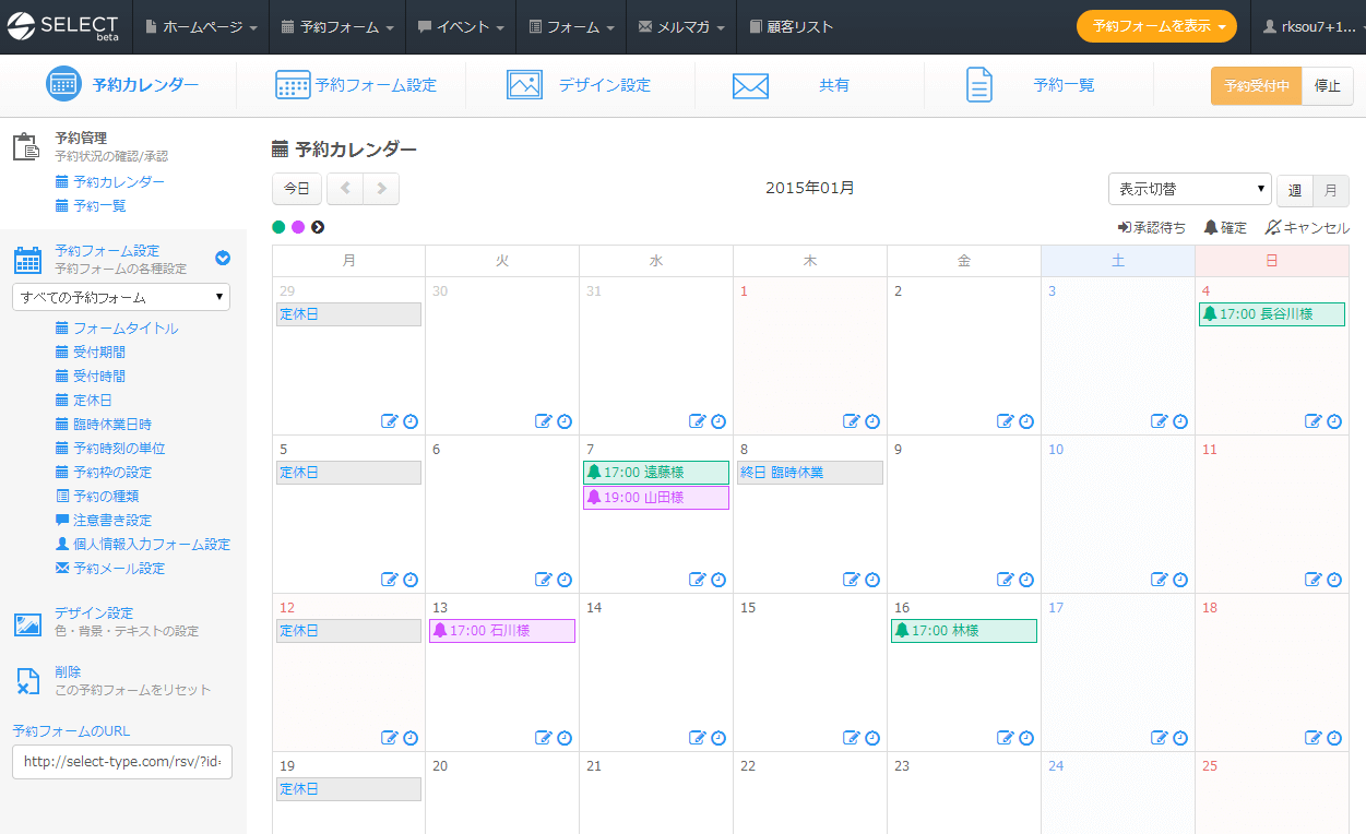 個別の予約フォームに、それぞれ各担当者を設定して予約情報を閲覧・管理することが可能な予約システムです。
