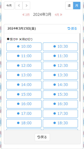 スタッフのシフト、臨時の出勤/お休み、同時に接客できる数を登録すれば、後はシステムが自動的に受付スケジュールを作成して予約受付カレンダーを表示します。