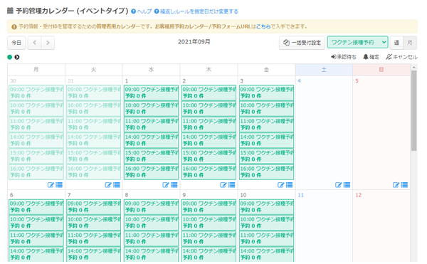 指定した日時に受付ける方法や特定の条件をもとに定期的に受付する方法などワクチン接種可能な日程にあわせて予約受付スケジュールの設定が可能です。トラブルなどですぐに受け入れを停止しなければならない場合や受付可能数を増やしたい場合にも、管理カレンダーからすぐに対応できます。