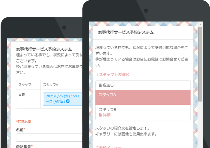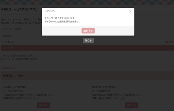 スタッフ指名のご予約受付にも対応していますので、スタッフの皆様のキャラクター・得意業務を前面に押し出したお客様へのアピールも可能です。「当日までどのようなスタッフが来るかわからない」という状況を回避することで、初見のお客様のご利用までのハードルを下げる期待が出来ます。