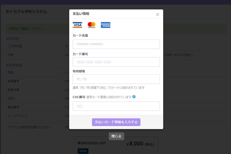 クレジットカードやコンビニ支払いによるオンライン決済にも対応した予約システムです。決済蛇行システムStripeですので、最短1日で導入・支払い受付を開始出来ます。出張サービスですので、事前にデポジットを徴収するといった保険的なご請求も可能ですしまた事後の追加発生料金徴収もオンラインにて実施いただけます。