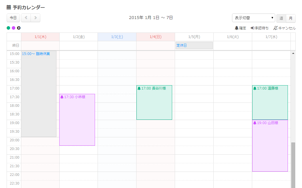 SelectTypeの予約システムでは、カレンダー上に予約された顧客名と予約時間が表示され「いつ予約されているか」が確認できます。また臨時で設定されたお休みの情報や定休日も表示されます。