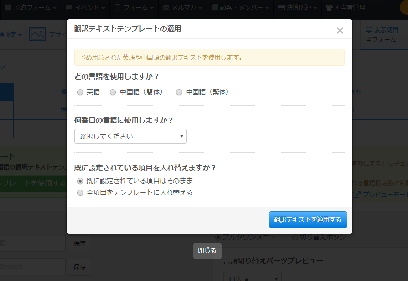 予約フォームの日本語テキストを導入したい翻訳テキストですぐにセットアップされますので変更したい箇所のみオリジナルテキストに調整しながらスムーズに多言語対応が行えます。